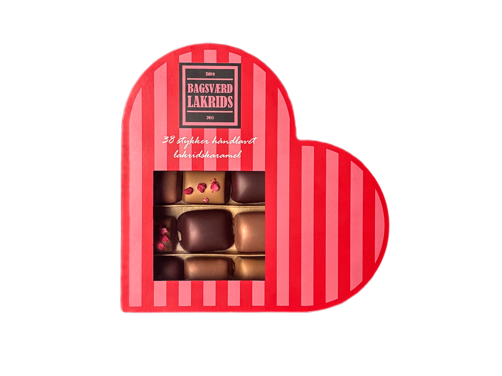 Årets hjerteæske indeholder 38 stykker håndlavet Bagsværd Lakrids med chokoladeovertræk, i varianterne Mørk Symfoni, Lys Symfoni, Hindbær Symfoni og Guld Symfoni.