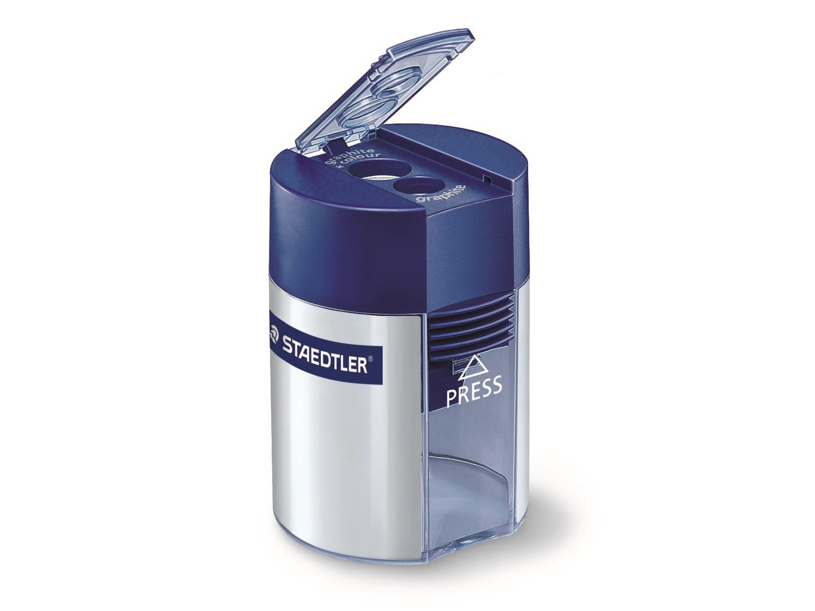 Blyantspidser med 2 skær og med praktisk beholder til "blyantskrald" fra Staedtler. Der er to spidsehuller med forskellig diameter. Kan også anvendes til spidsning af trekantede blyanter. Ass. farver.