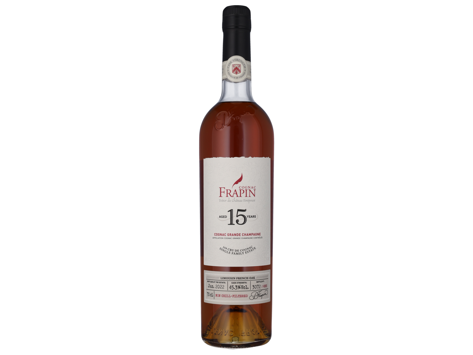 Sammensat af årgangscognac som er min. 15 år gamle og som udelukkende er lavet på Ugni Blanc druer, som dyrkes på Domaine Frapins vinmarker.Under hele produktionen – både under destilleringen og modningen – bliver disse cognac´er holdt adskilt fra de andre cuvéer, udvalgt for deres lethed og renhed. De Cuveer, som er beregnet til at indgå i 15 Years Old Cognac, bliver først modnet 6 måneder på nye træfade fra Limousin, for at fremhæve og bevare de unge cognac´ers umiddelbare frugttoner. Derefter følger en modning i 10 år på 5-20 års træfade, 8 år i såkaldte “chaix secs” – tørre loftsrum, hvor både en del af alkoholen men især vandet fordamper (som på Château Fontpinot i øvrigt). Disse tørre loftsrum giver mere intense og samtidig mere delikate og aromatiske toner i cognac. I de resterende to år bliver Cognac modnet i mere fugtige kældre, hvor kun alkoholen fordamper (3% årligt – “la part des anges” – englenes andel) og derved får mere rundhed og charme. Til sidst får 15 Years Old Cognac min. 5 år på ældre træfade. Hele processen foregår “Sur Lie” (med eget bundfald). Ifølge gældende lovgivning i Cognac har denne Cognac lagret under lås og slå (og under myndighedernes kontrol), siden den blev destilleret.15 Years Old Cognac bør serveres ved rumtemperatur men ikke for varmt. Dens finesse og frugt kommer bedst frem ved normal temperatur. Det anbefales at give cognacen 2-3 minutters iltning i glasset. Man vil derefter kunne nyde en utroligt kompleks og intens Grande Champagne 1. Cru du Cognac med eksotiske nuancer og en uforlignelig finesse. Nogle beundrer den for finessen, andre for dens strukturerede og næsten ”maskuline” stil. En kompleks sag!