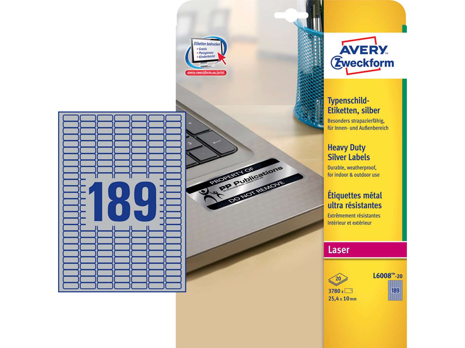 LASERETIKET AVERY L6008-20 SØLV 25,4X10MM HEAVY DUTY