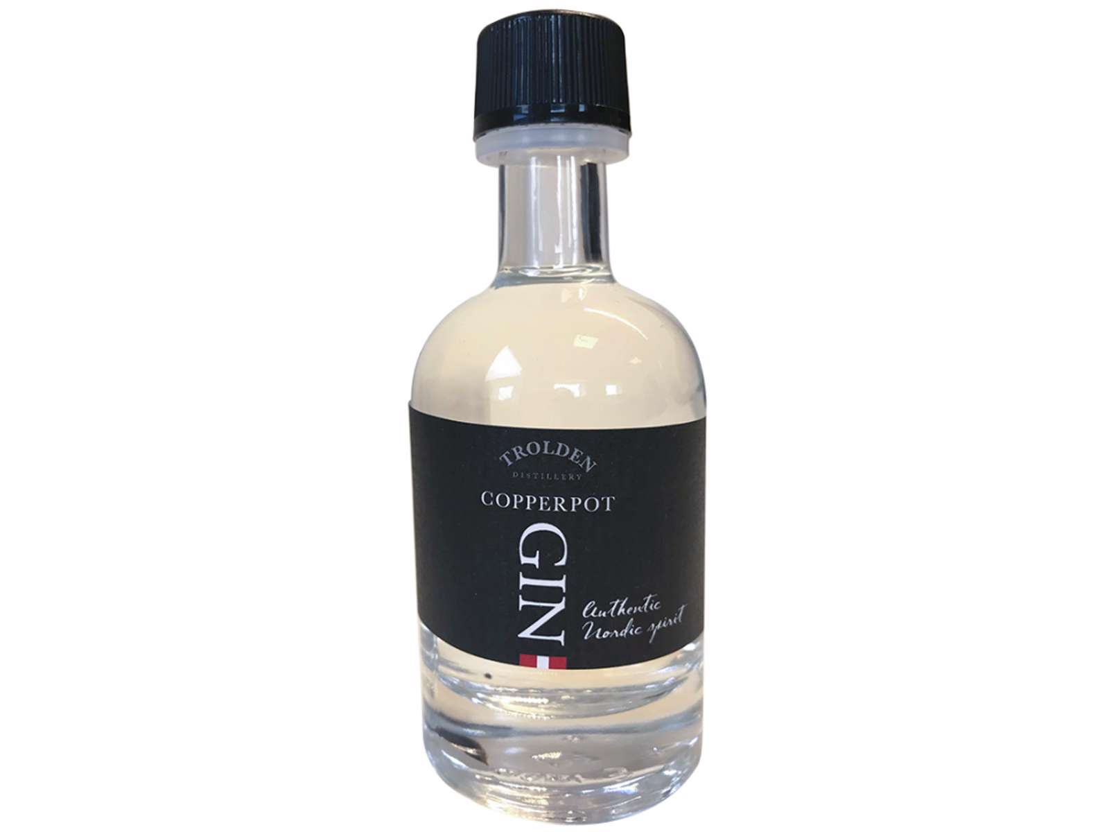 Copperpot Gin fremstillet med nænsom destillering på små, håndbankede kobberkedler. Trolden Distillery anvender en såkaldt ‘infusion box’ (en trådkurv inde i selve kobberkedlen) til at opfange de fineste nuancer af aroma og smag. Ingredienslisten inkluderer: enebær, koriander, ingefær, orangeskal, lime og angelikarod.