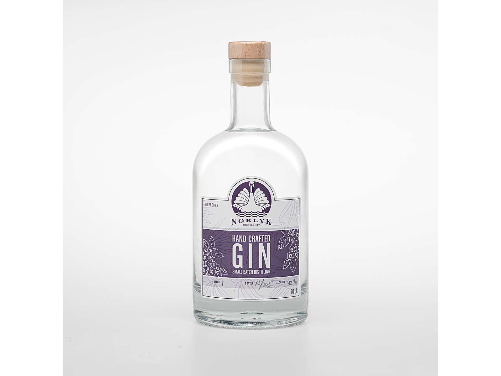 Norlyk Blueberry Gin er lavet på første- og andetårs enebær, enebærkviste samt sønderjysk dyrkede blåbær. Smagen er ren og blød, med et strejf af sødme og syrlighed fra bærrene. Den kan nydes ren eller med en simpel tonic, isterninger og et par frosne blåbær.
