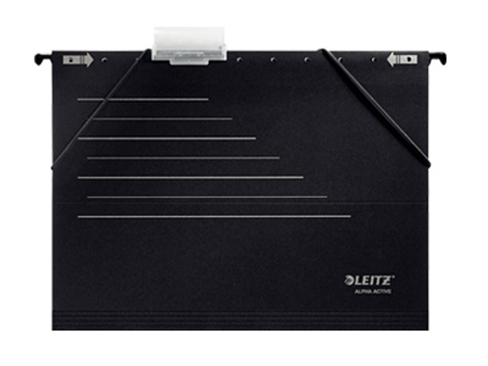 Kvalitets hængemappe med kroge og etiketholder, der kan skubbes ind, tilpasset anvendelse på farten. * Skinne, hvor kroge kan skubbes ind, gør det lettere at tage hængemappen med * Elastiklukning holder dokumenter sikkert på plads og gør transporten nemmere * Etiketholder kan skubbes ned men stadig være synlig. Inkl. papirindstik der måler HxB: 21x60mm