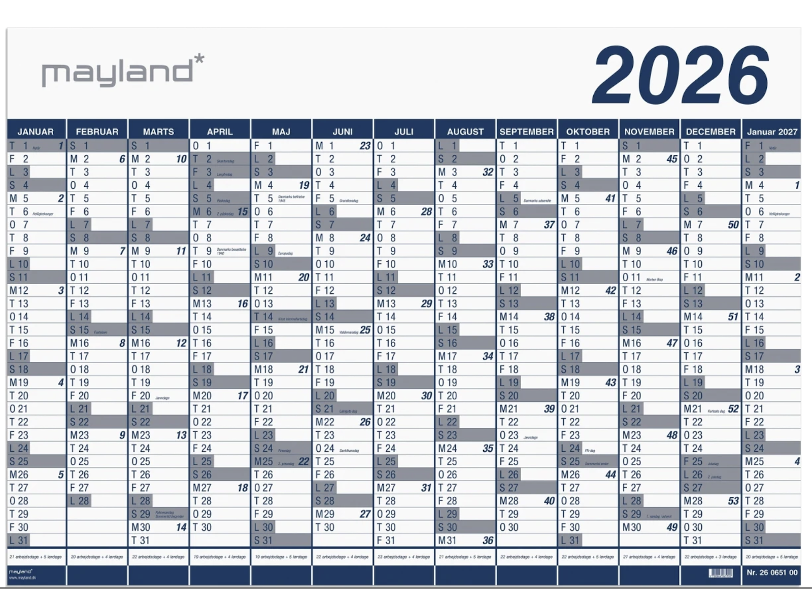 Kæmpekalender 70x100 cm i miljøvenlig plast med 13 månedsoversigt (i plastpose). Vægkalenderen giver dig en oversigt over alle 12 måneder i året samt for januar det efterfølgende år. Med årskalenderen kan du hurtigt og nemt skabe et godt og overskueligt overblik over året og alle dets aktiviteter. Du kan skrive på plastkalenderen med en vandbaseret non-permanent marker, som nemt kan fjernes igen med en fugtig klud. Brug f.eks. en Staedtler Lumocolor 315. kalenderen er identisk med varenr. xx065000 i paprør.