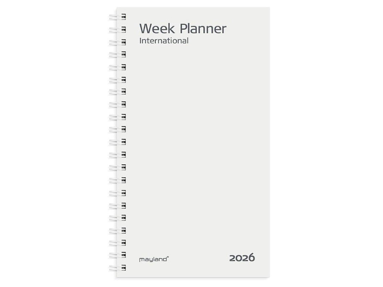 Mål: 170 x 98 x 13 mm. Layout: Uge/opslag. Tværformat. Kalendarium: 2026-01-01 – 2026-12-31. Omslag: Karton. Spiralbundet. Indhold: Månedsoversigter. Sideantal: 128 + 14-pl. Miljøoplysninger: FSC®. Varemærke: Mayland.