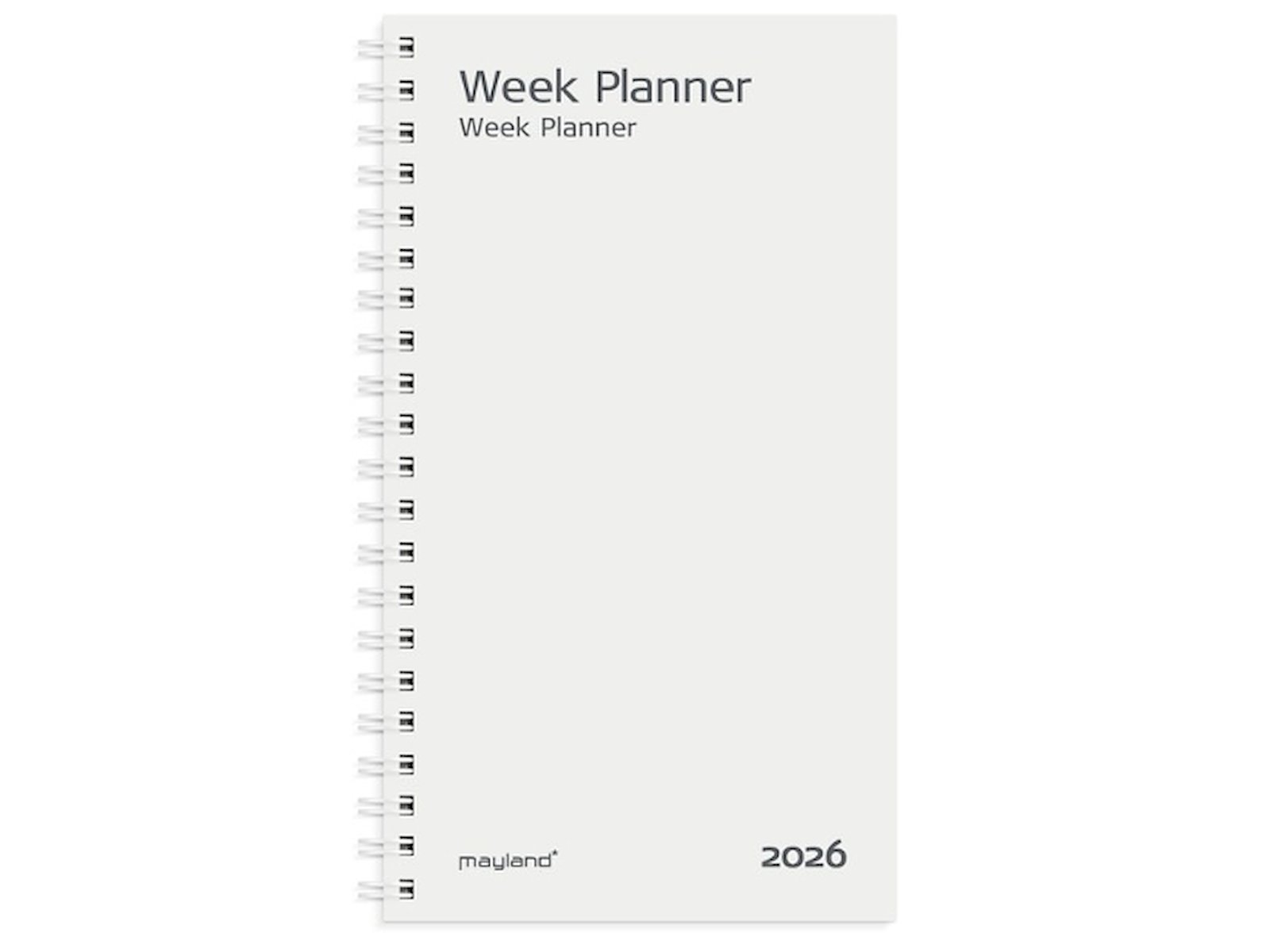 Mål: 168 x 102 x 12 mm. Layout: Uge/opslag. Højformat. Timeinddeling 8-18. Kalendarium: 2026-01-01 – 2026-12-31. Omslag: Karton. Spiralbundet. Indhold: Månedsoversigter. Sideantal: 128 + 14-pl. Miljøoplysninger: FSC®. Varemærke: Mayland.