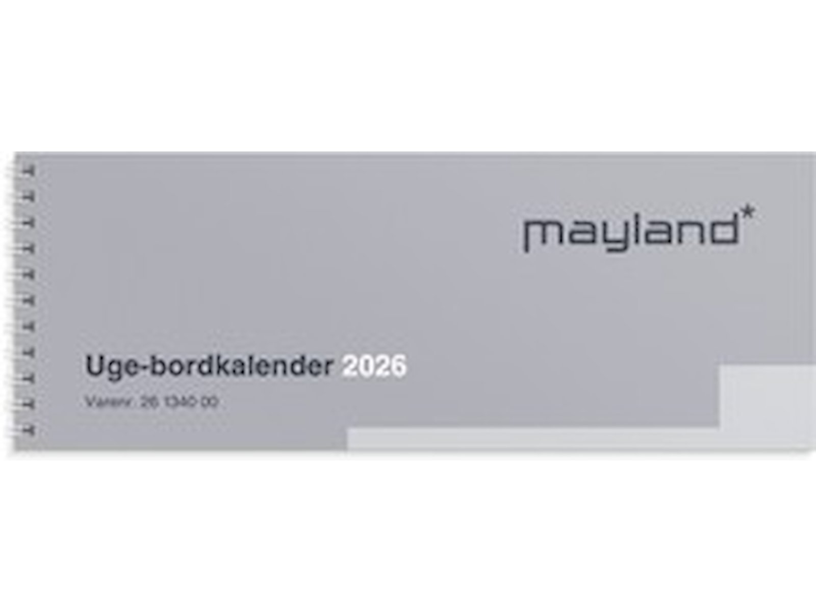 Mål: 97 x 257 x 12 mm. Layout: Uge/opslag. Højformat. Timeinddeling 8-16. Kalendarium: 2026-01-01 – 2026-12-31. Spiralbundet. Sideantal: 116. Miljøoplysninger: FSC®. Varemærke: Mayland.