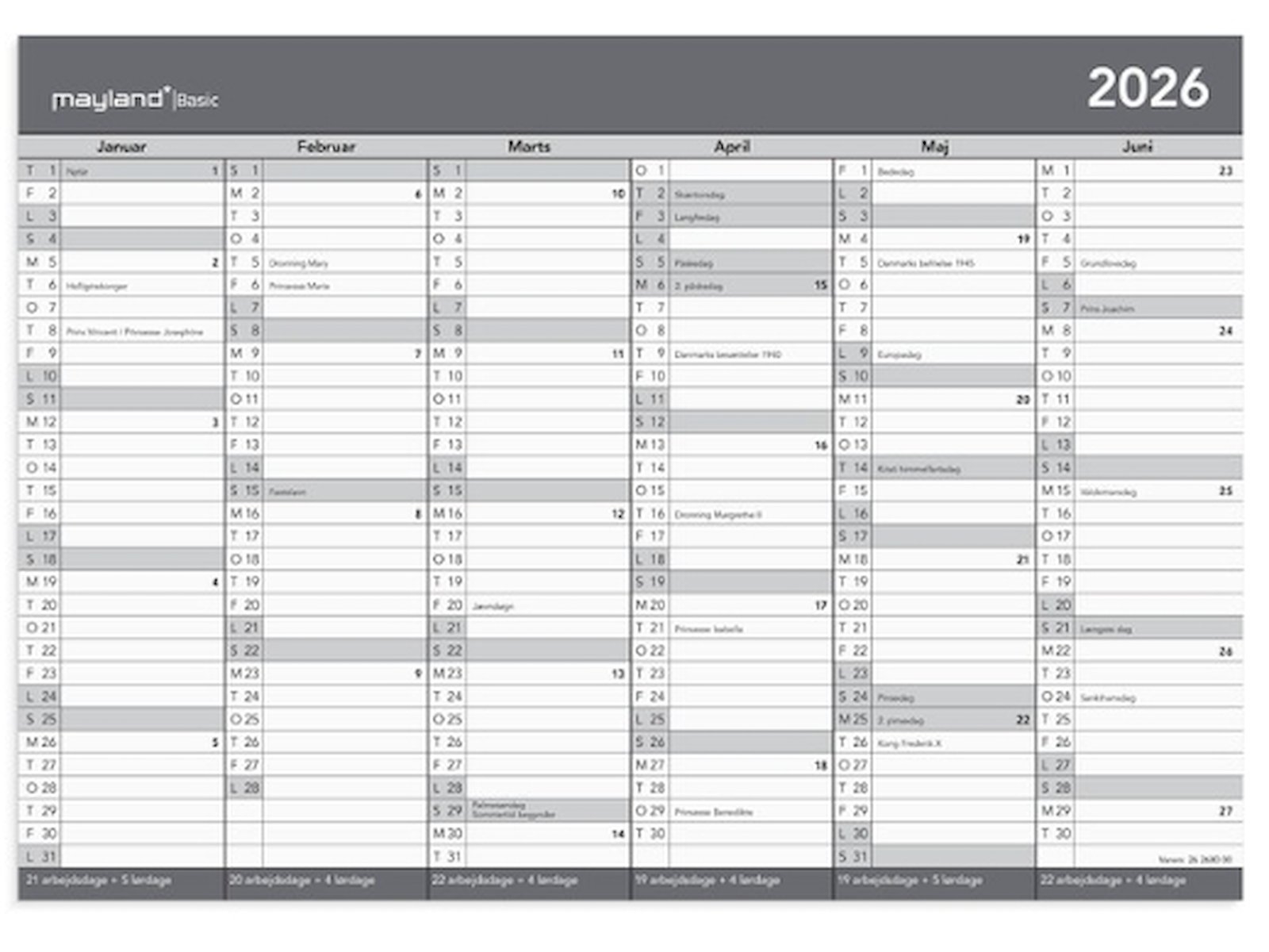 Format: A4. Mål: 210 x 292 x 1 mm. Layout: Halvår/side. Tværformat. Kalendarium: 2026-01-01 – 2026-12-31. Sideantal: 1. Miljøoplysninger: FSC®. Varemærke: Mayland.