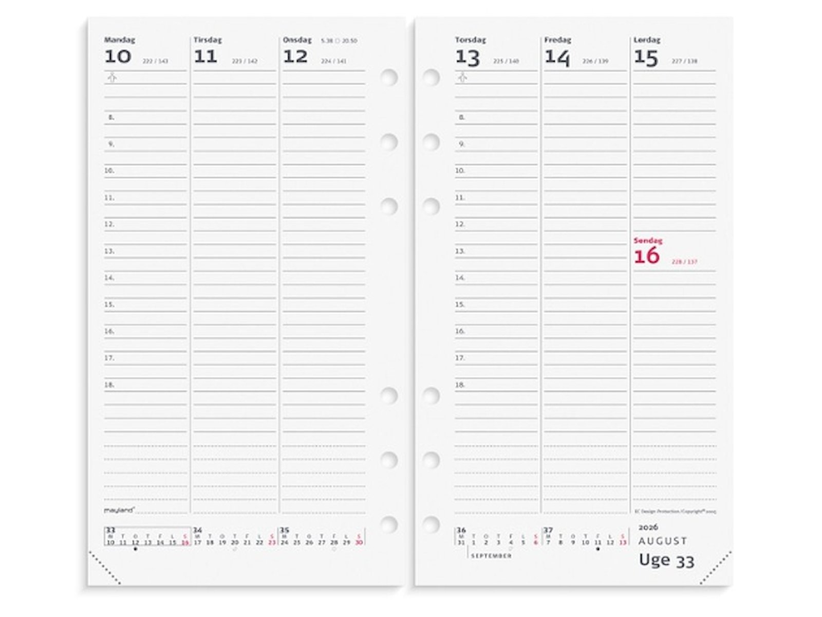 Mål: 168 x 96 x 11 mm. Layout: Uge/opslag. Højformat. Timeinddeling 8-18. Kalendarium: 2026-01-01 – 2026-12-31. Omslag: Karton. Indhold: Månedsoversigter. Sideantal: 128 + 14 pl. Miljøoplysninger: FSC®. Varemærke: Mayland.