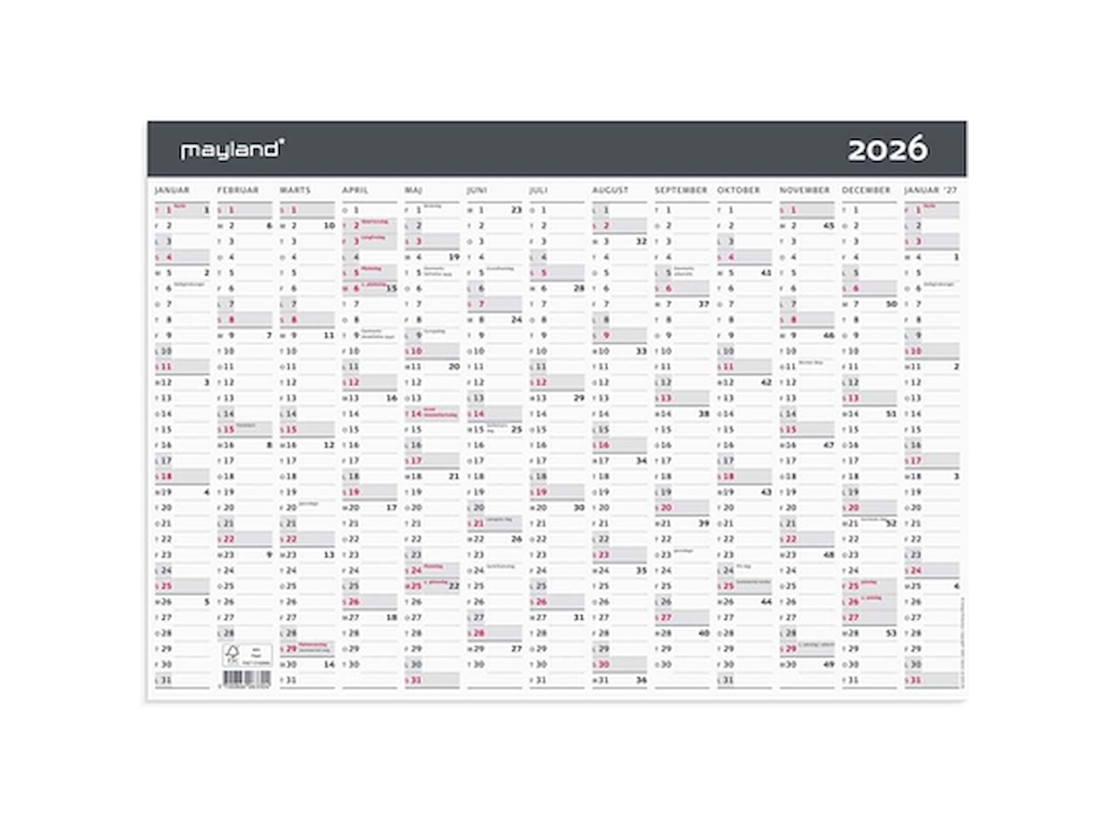 Kontorkalender i karton og moderne design med 13 månedsoversigt. Vægkalenderen giver dig en oversigt over alle 12 måneder i året samt for januar det efterfølgende år. Med årskalenderen kan du hurtigt og nemt skabe et godt og overskueligt overblik over året og alle dets aktiviteter.