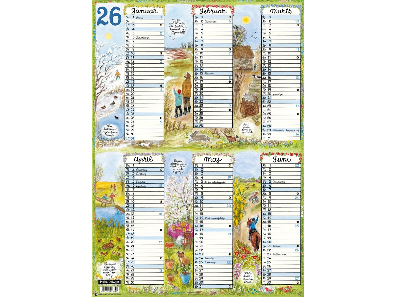 Hvert ark er 50x70 cm og viser et halvår på hvert ark.Kalenderen er velegnet til køleskabsdøren, men også på kontoret.
