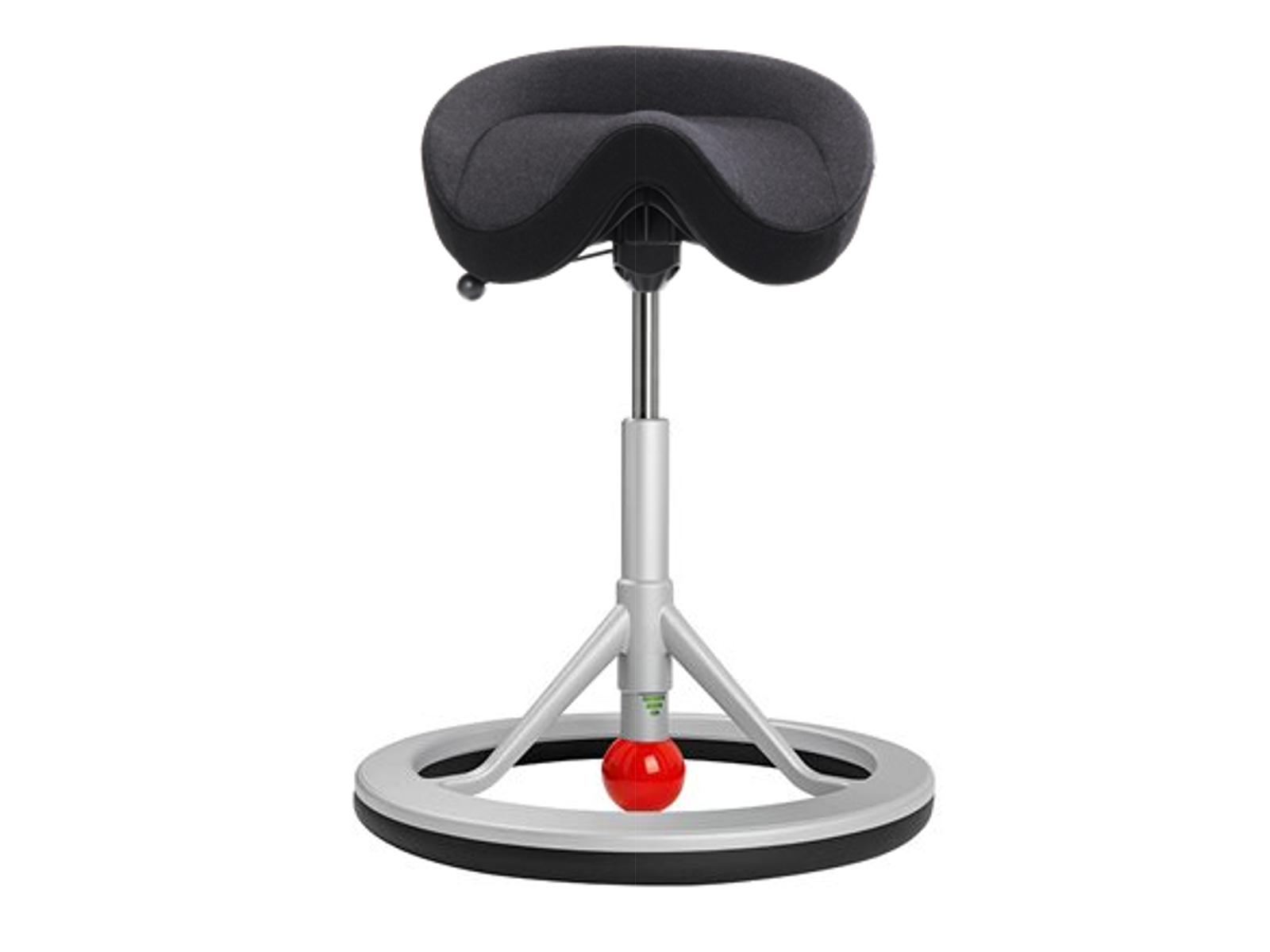 Kuglen er støbt fast i røret som kan skrues ind og ud af aluminiumsunderstellet, for at regulere hvor meget vippefunktion der skal være på stolen.