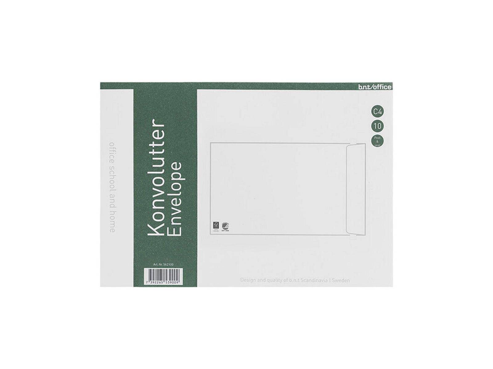 Svanemærkede hvide kuverter med peel & seal stripe og lukning på kort side.