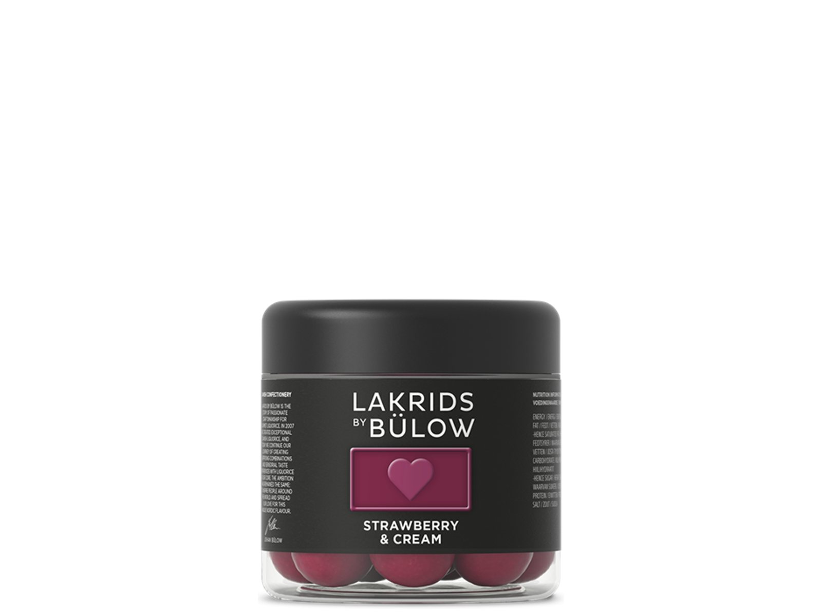 LAKRIDS OVERTRUKKET MED JORDBÆR/JORDGUBBAR, FLØDE/GRÄDDE OG HVID CHOKOLADE: Ingredienser: 50% hvid chokolade (EU) (sukker, kakaosmør, SØDMÆLKS-/HELMJÖLKSPULVER, emulgator: SOJALECITIN, naturlig vaniljearoma), sukker, rismel/ rismjöl, invertsukkersirup, melasse, glukosesirup, kakaosmør, SØDMÆLKS-/HELMJÖLKSPULVER, 3% jordbær/jordgubbar (EU) (frysetørret), 2% rålakrids (ikke-EU), rapsolie, salt, 0.4% vanilje- aromatiseret fløde-/gräddepulver (ikke-EU) (FLØDE/GRÄDDE (spraytørret), naturlig aroma), overfladebehandlingsmidler/ytbehandlingsmedel (arabisk gummi, carnaubavoks), syre: æblesyre, emulgator: SOJALECITIN, naturlige aromaer, farvestof: carmin, anisolie. Mindst 26% kakaotørstof. Glutenfri.