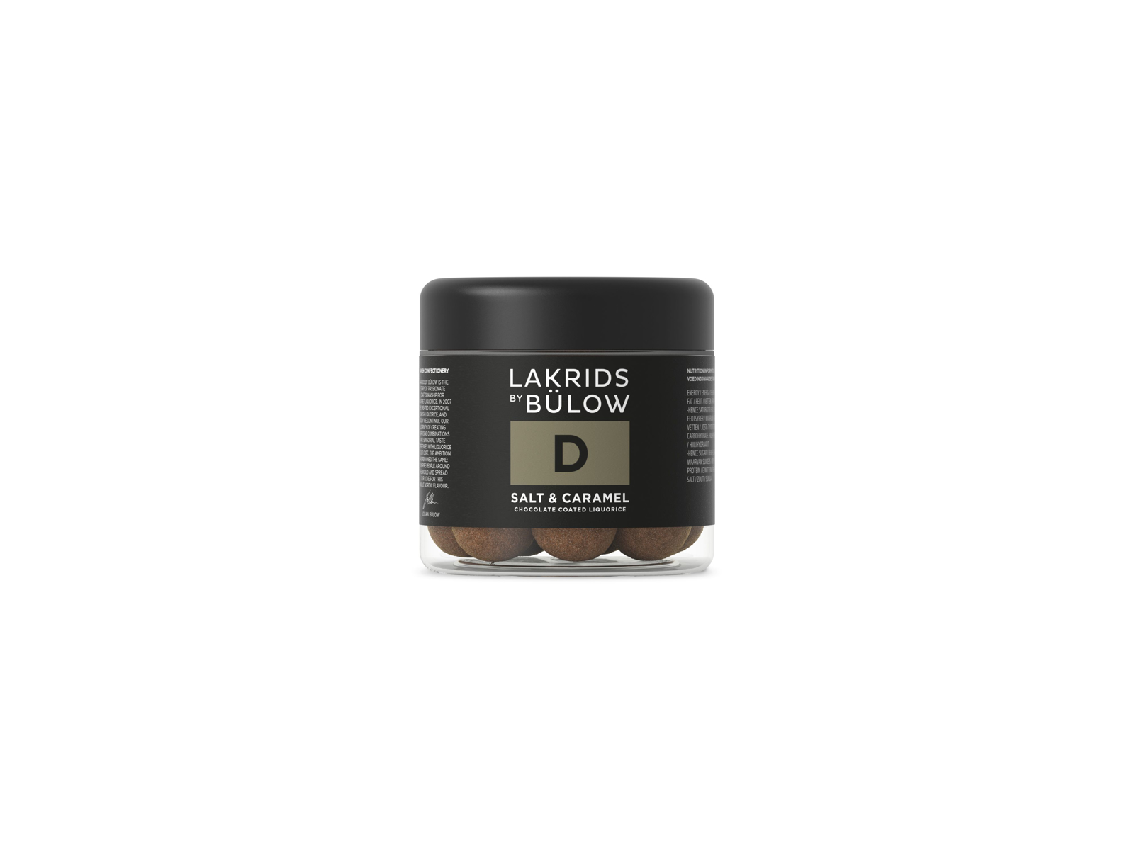 DULCE CHOKOLADEOVERTRUKKET LAKRIDS: Ingredienser: 61% dulce chokolade (sukker, MÆLKE-/MJÖLKPULVER, kakaosmør, VALLE-/VASSLE-/MYSEPULVER, kakaomasse, MÆLKEFEDT/MJÖLKFETT, emulgator: SOJALECITIN, naturlige aromaer), rismel/rismjöl, invertsukkersirup, sukker, melasse, glukosesirup, 3.4% rålakrids, 0.9% havsalt, rapsolie, salt, dextrose, alkaliseret kakao, overfladebehandlingsmiddel/ytbehandlingsmedel: shellak, anisolie. Mindst 27 % kakaotørstof. Glutenfri.