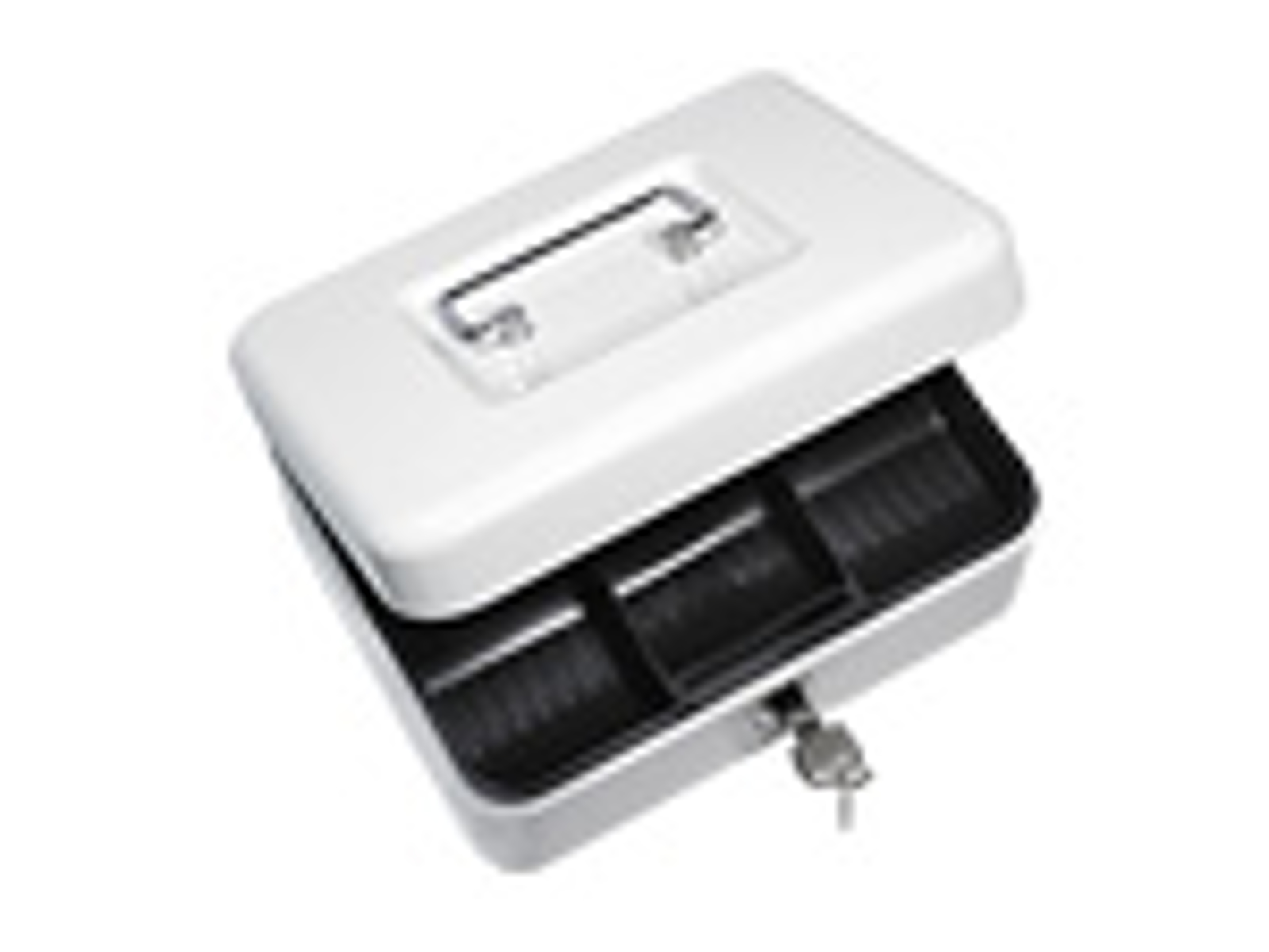 Hvid pengekasse, BNT i formspændt stål med cylinderlås, 2 nøgler og 6-rums møntbakke i plast, hvorunder der er plads til sedler. Er forsynet med bærehåndtag. Bemærk størrelsen!