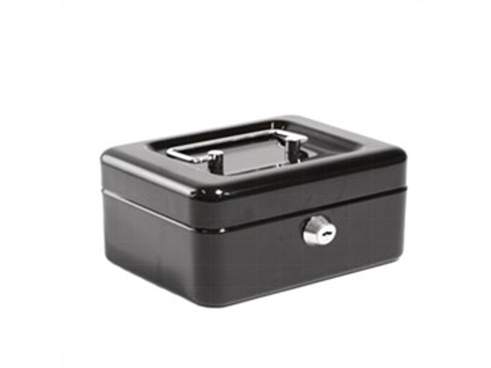 Sort pengekasse, BNT i formspændt stål med cylinderlås, 2 nøgler og 6-rums møntbakke i plast, hvorunder der er plads til sedler. Er yderligere forsynet med bærehåndtag.