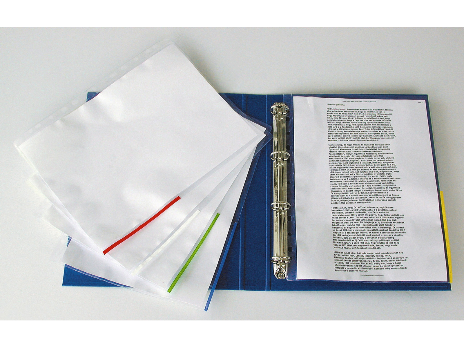 Stærk lomme til konstant hverdags brug. Ideel opbevaring i brev- og ringordnere. Farvet kant gør det muligt at arkivere efter farvekode