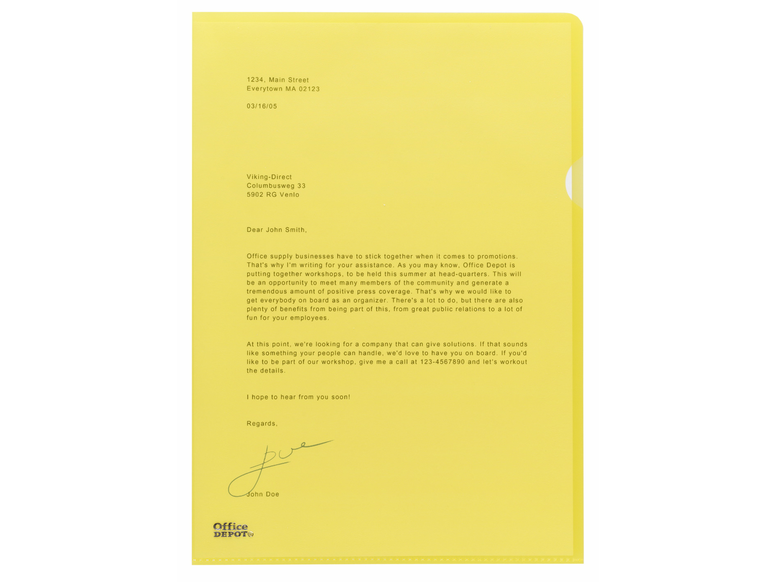 Gult gennemsigtigt plasticomslag til dokumenter, der ønskes beskyttet mod snavs og fugt. Åbning på 2 af siderne og med præg.