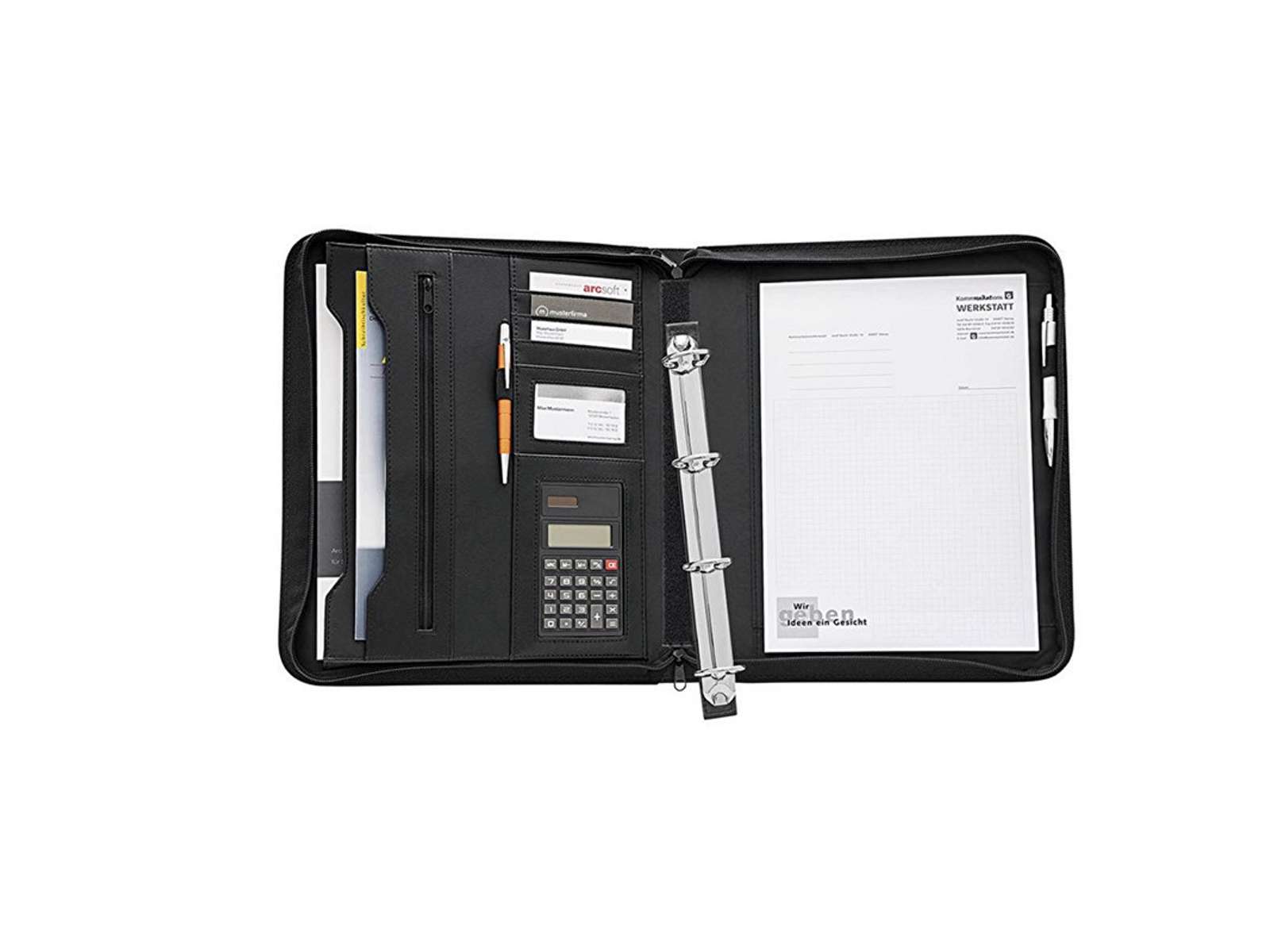 Med ringmekanisme 34 mm, solar lommeregner, mange lommer, penneholder m.v.