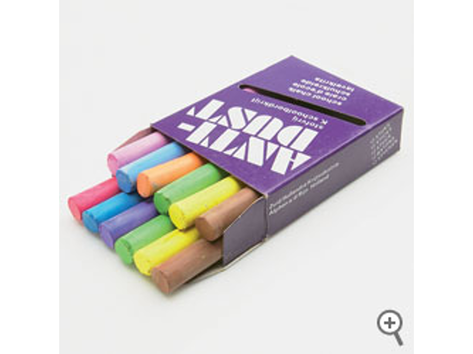 Kulørte tavlekridt i assorterede farver. Kan også tegne på asfalt og andre ru overflader. Udviskes nemt ved hjælp af fugtug klud eller vand.