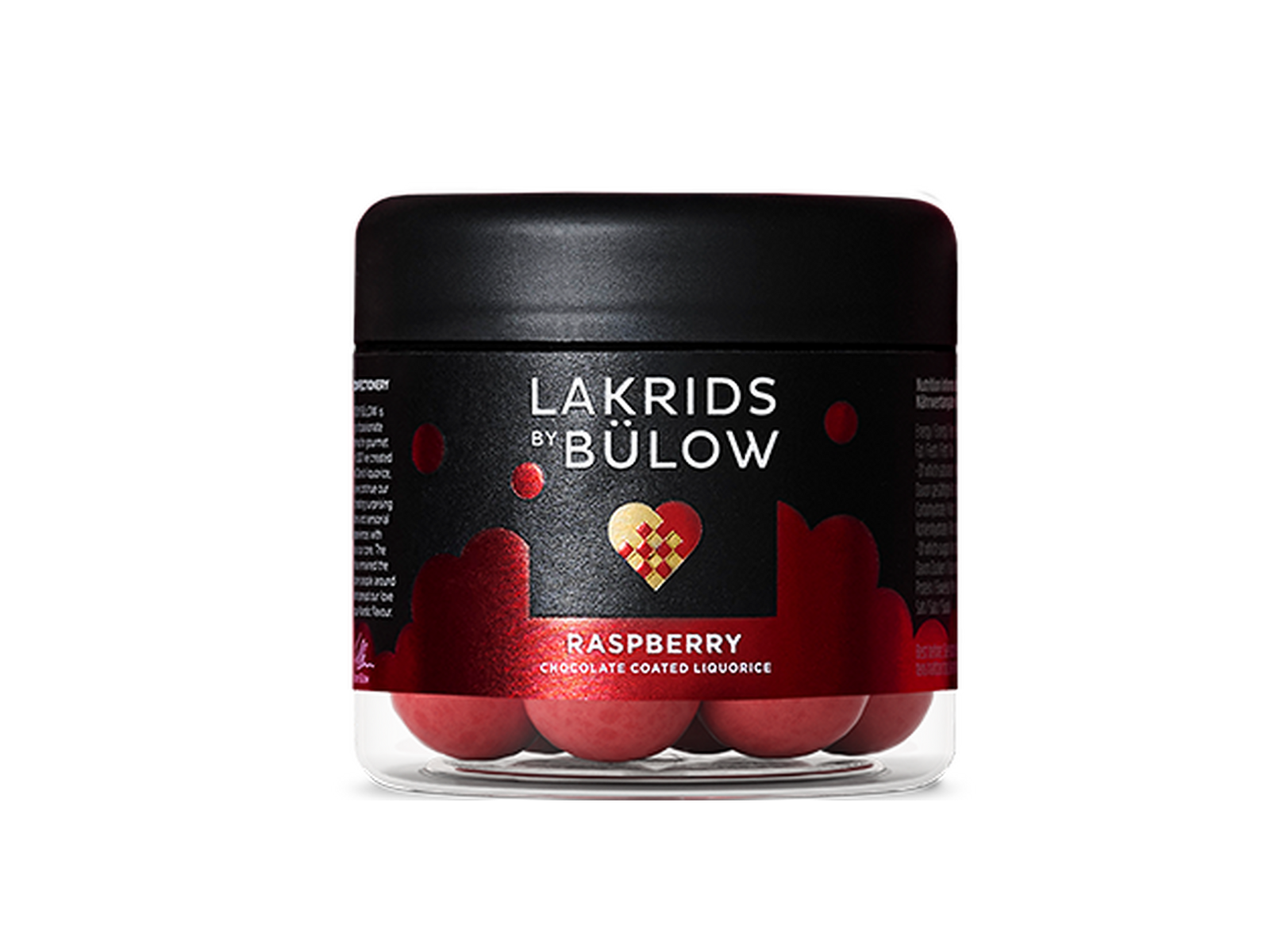 Sød lakrids overtrukket med hindbær/ bringebær/hallon, hvid chokolade og sukker: