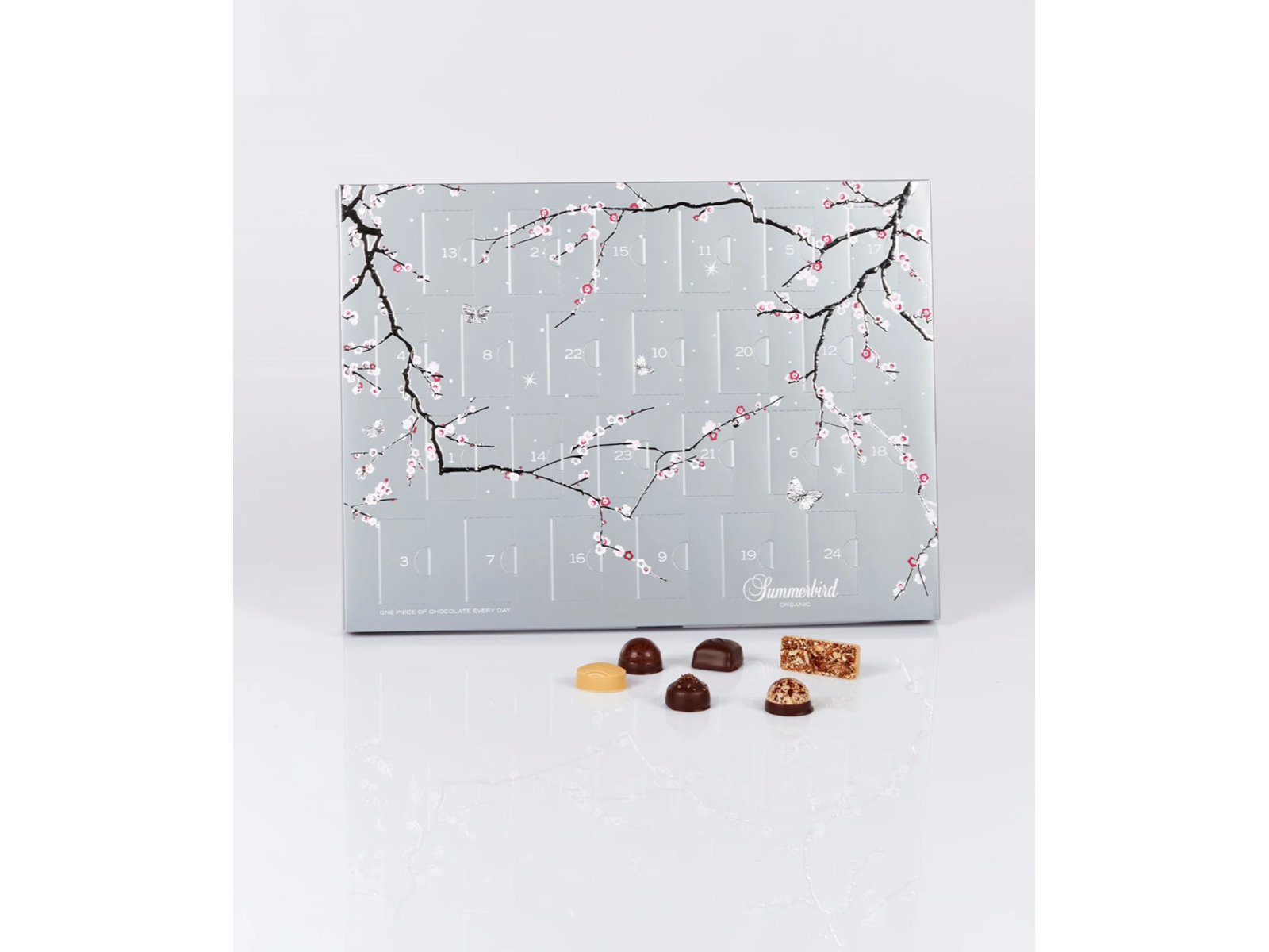 Årets klassiske julekalender med sølvmotiv er inspireret af det ikoniske tapet, som dekorerer alle vores Summerbird-Chocolaterier. Julekalenderen indeholder både vores smagfulde chokoladebarer og elegante, fyldte chokolader. Julekalenderen indeholder 12 forskellige varianter. Bag hver låge gemmer sig 1 stykke chokolade.