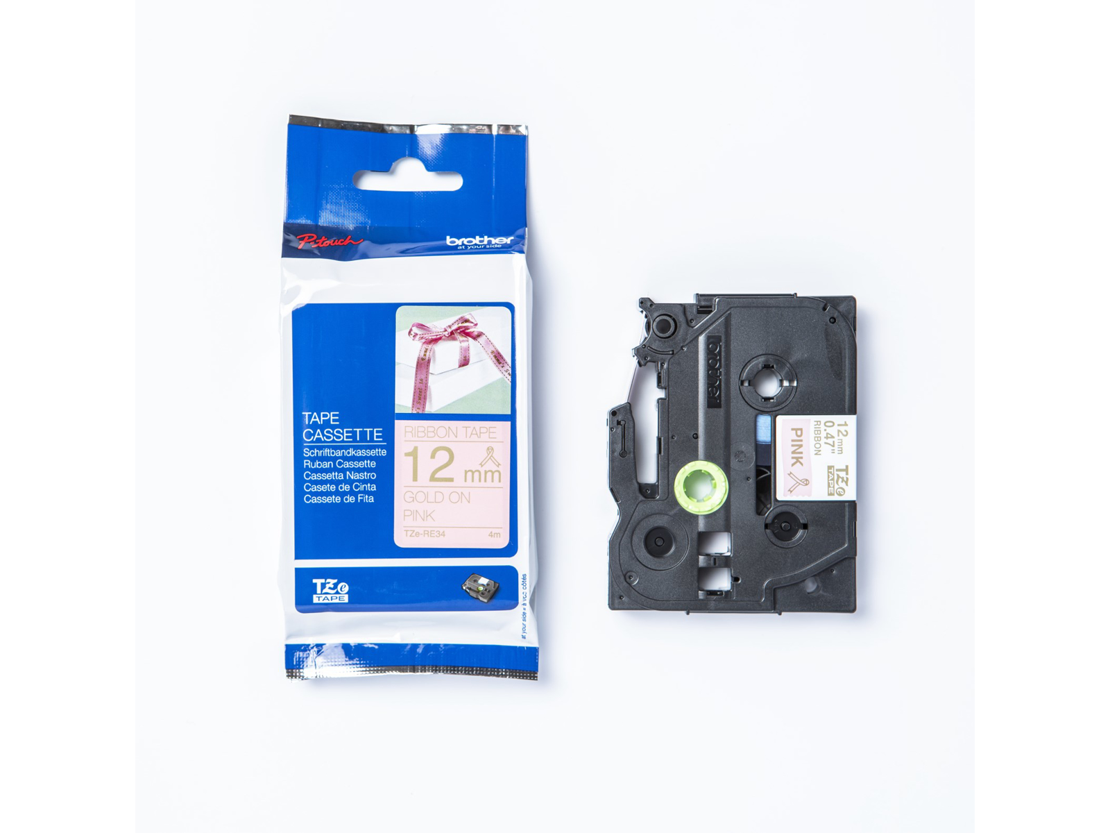 TZe-RE34 printer guld tekst på pink bånd