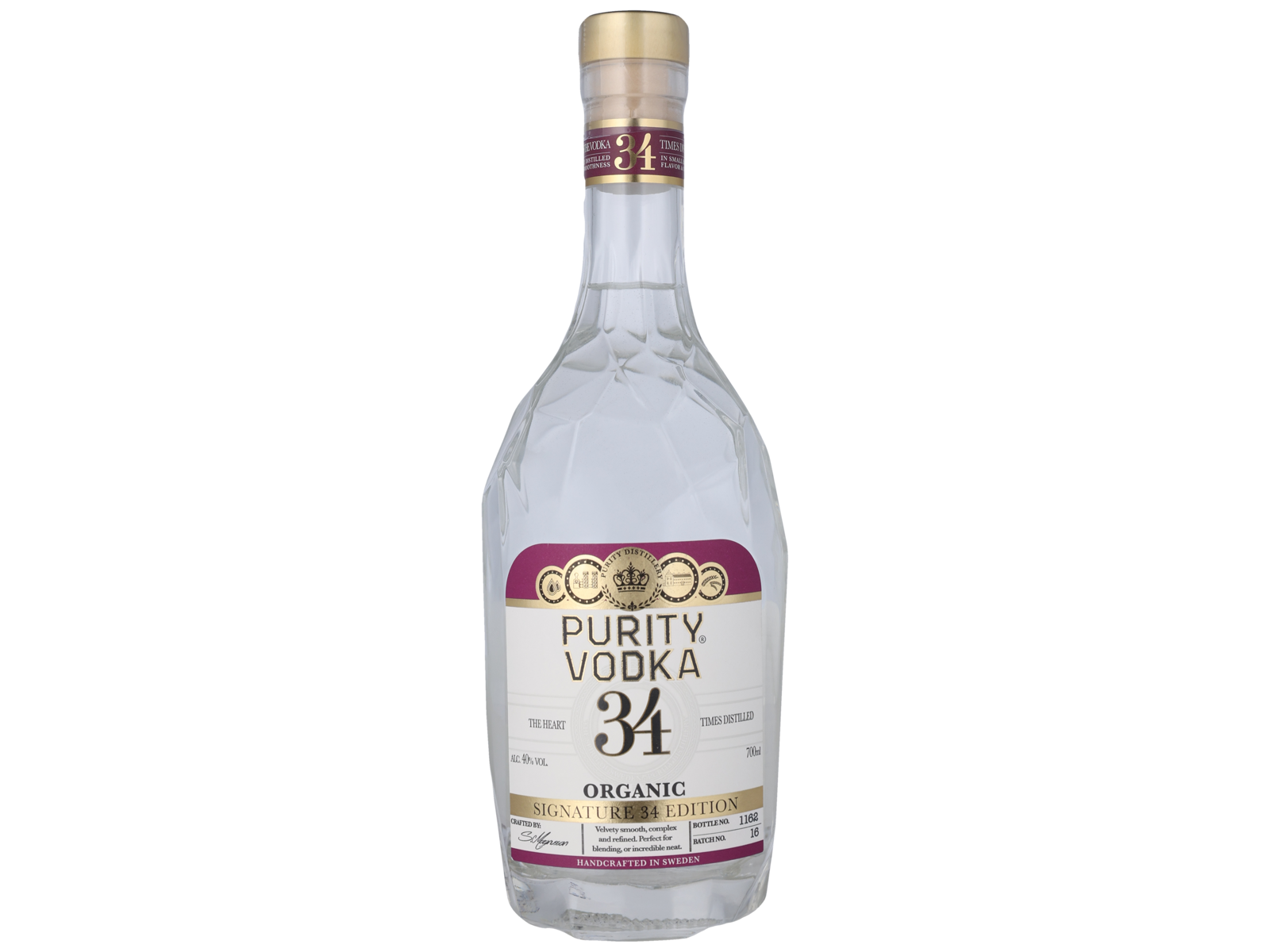 Purity Vodka Ultra Premium 34 er Puritys første vodka, og klart den som har vundet flest medaljer. Vodkaen er destilleret først i en kobberkedel og derefter i to 8 rums “multilayer” kontinuerlige kobberkedler. Her opnår man 17 destillationer (1+8+8), hjertet af de 17 første destillationer (hoved kommer først, så hjerte og så hale) vandes ned med lokalt svensk mineralrigt vand, for så at blive destilleret igennem hele processen igen. Dermed opnår man 34 destillationer. Resten omdestilleres. Purity smager bedre end andre vodkaer fordi man bruger både hvede og byg til brug i gæringen, fordi man bruger enormt mineralrigt svensk vand og kun det bedste økologiske korn og fordi man bruger en langsommere destillationprocess som giver bedre kvalitet.