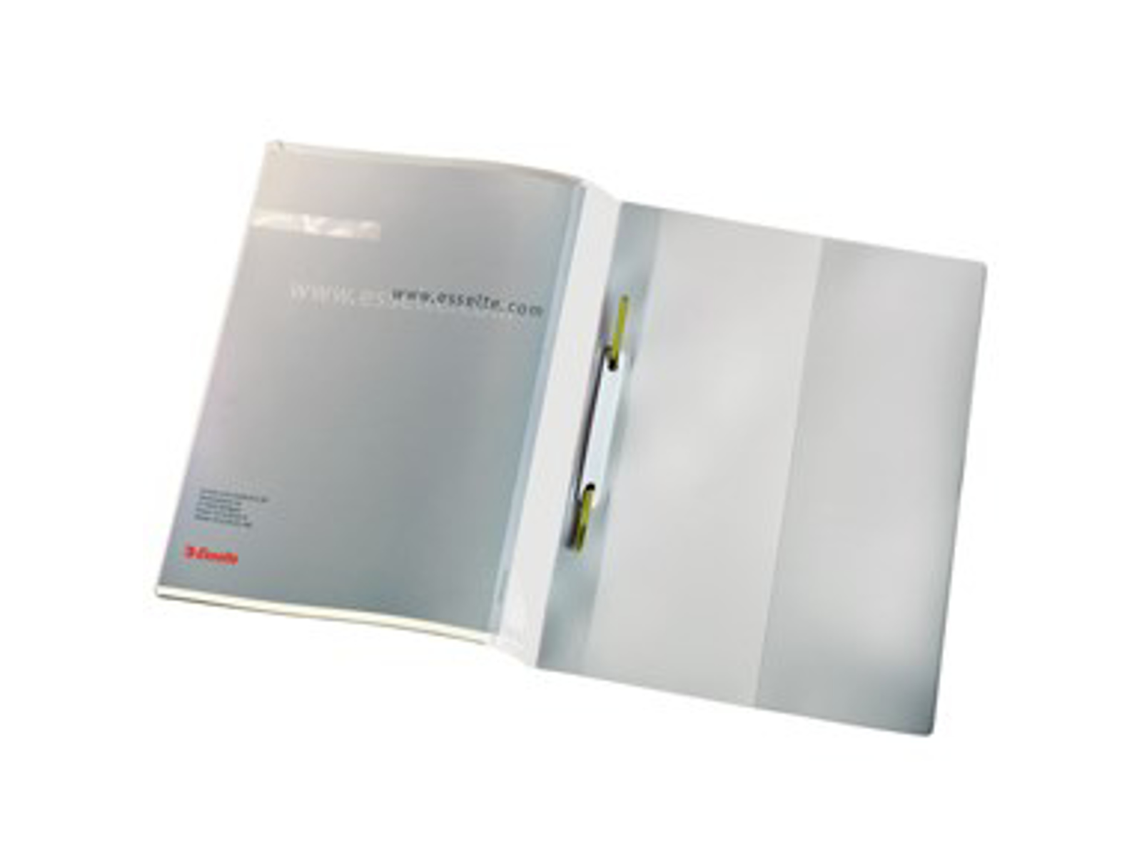 Tilbudsmappe i PVC med forside i dobbelt plast til indstik af egen forside, hvid90 mm bred lomme indvendig.Metal arkiveringsmekanisme med plastikoverliggerTil A4 format